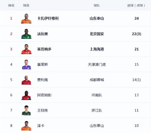 射手榜上,山東泰山前鋒卡扎伊什維利在與上海海港的比賽中獨(dú)中兩元,以24球繼續(xù)領(lǐng)跑。北京國安的法比奧本輪打進(jìn)一球,以22球繼續(xù)緊追卡扎伊什維利。上海海港的萊昂納多本輪無有建樹,終結(jié)了近期4場8球的良好勢頭,以21球位列第三。助攻榜上排在第一的是河南隊(duì)的納薩里奧,他已送出9次助攻,但其身后有8次助攻的多達(dá)4人,分別是韋世豪、維塔爾、澤卡和高天意,助攻王的爭奪更為激烈。